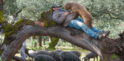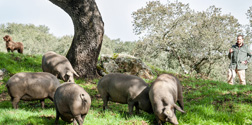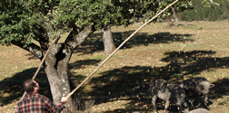 Los cochinos siguen al ganadero que les va vareando las encinas para que caiga el fruto.